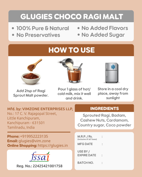 Raagi Choco Malt is a delicious and nourishing health drink made from sprouted ragi, blended with rich chocolate flavor and the natural sweetness of brown sugar, enhanced with a hint of aromatic cardamom. Sprouted ragi is known for its high calcium and iron content, making it excellent for strengthening bones and supporting overall growth. Combined with the goodness of cocoa, it provides natural energy and a satisfying taste that both kids and adults will love.